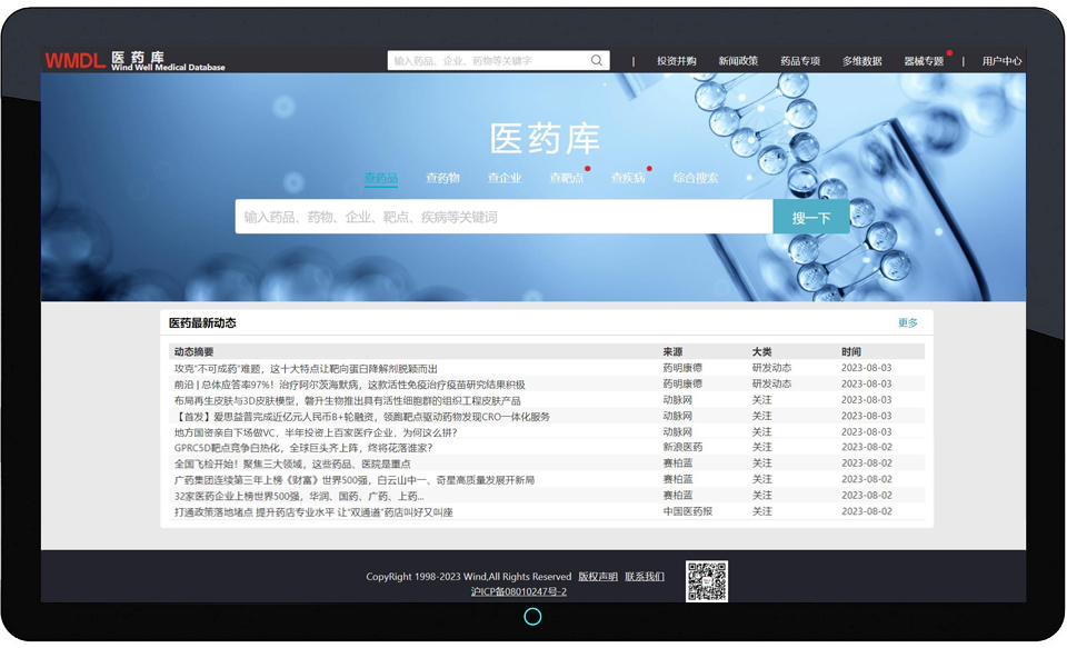 Drawing on years of data governance and analytical strength, WMDL has developed in deep cooperation with a number of industry leaders in medical sector, covering multi-dimensional data such as domestic and international news and policies, pharmaceutical companies, medicines and medical devices, distribution and sales, patents and literatures, hospital departments, investments, financings, M&As and industry macro, etc. It is one of the most professional medical databases with the widest data coverage, the best visualization and the most professional demand response in China at present.